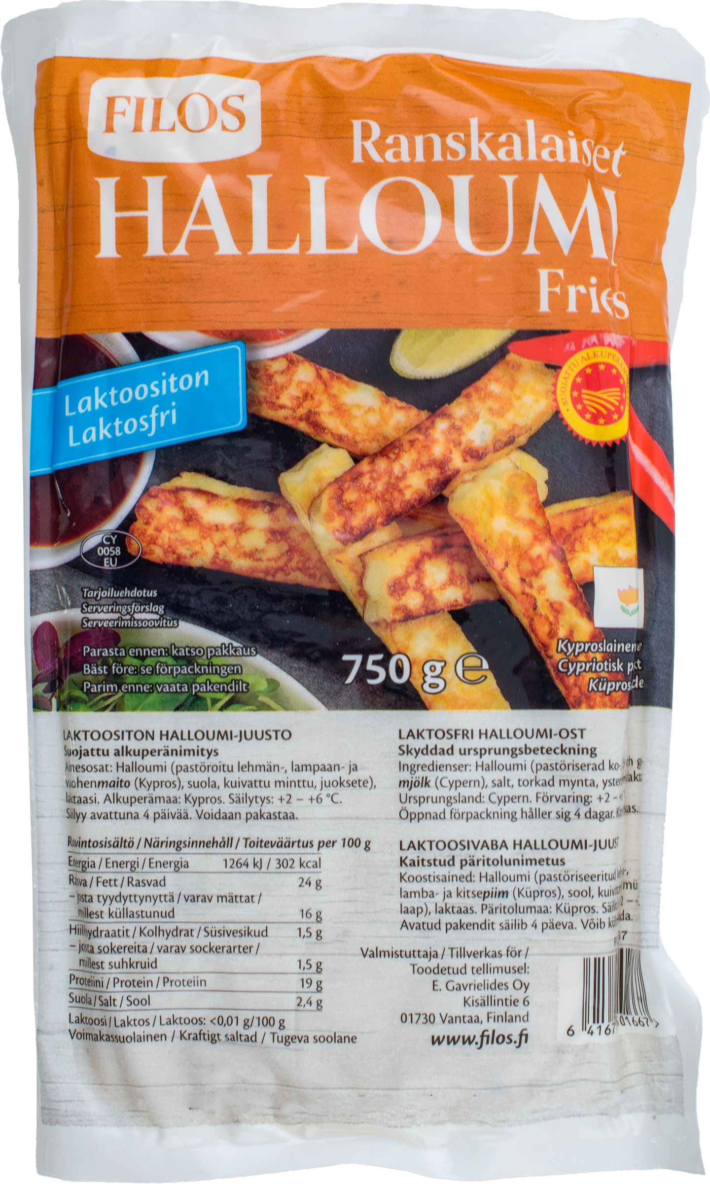 LaktoositonHalloumi-juusto on Kyproksen herkkujen helmi ja saarelaisten ylpeys. Se on myös kaikkien juuston ystävien vanha tuttu ja etenkin grillikauden suosikki. Filos halloumi-ranskalaiset on taattua laadukasta Filos halloumi-juustoa valmiiksi pilkottuna paksuiksi tikuiksi, jotka on helppo uppopaistaa öljyssä tai paahtaa pannulla. Halloumi ei sula ja pitää muotonsa kuumennettaessa. Halloumi-ranskikset voi myös leivittää perinteiseen tapaan vehnäjauhoissa, kananmunassa ja korppujauhoissa tai ihan vaan panko-jauhossa. Jos et käytä leivityksessä kananmunaa, kostuta halloumi ennen leivitystä hiukan vedellä. Halloumi-ranskalaiset on täydellinen herkkupala niin illanistujaisiin kuin arkipöytään. Dippaa mieleiseesi kastikkeeseen ja nauti!
