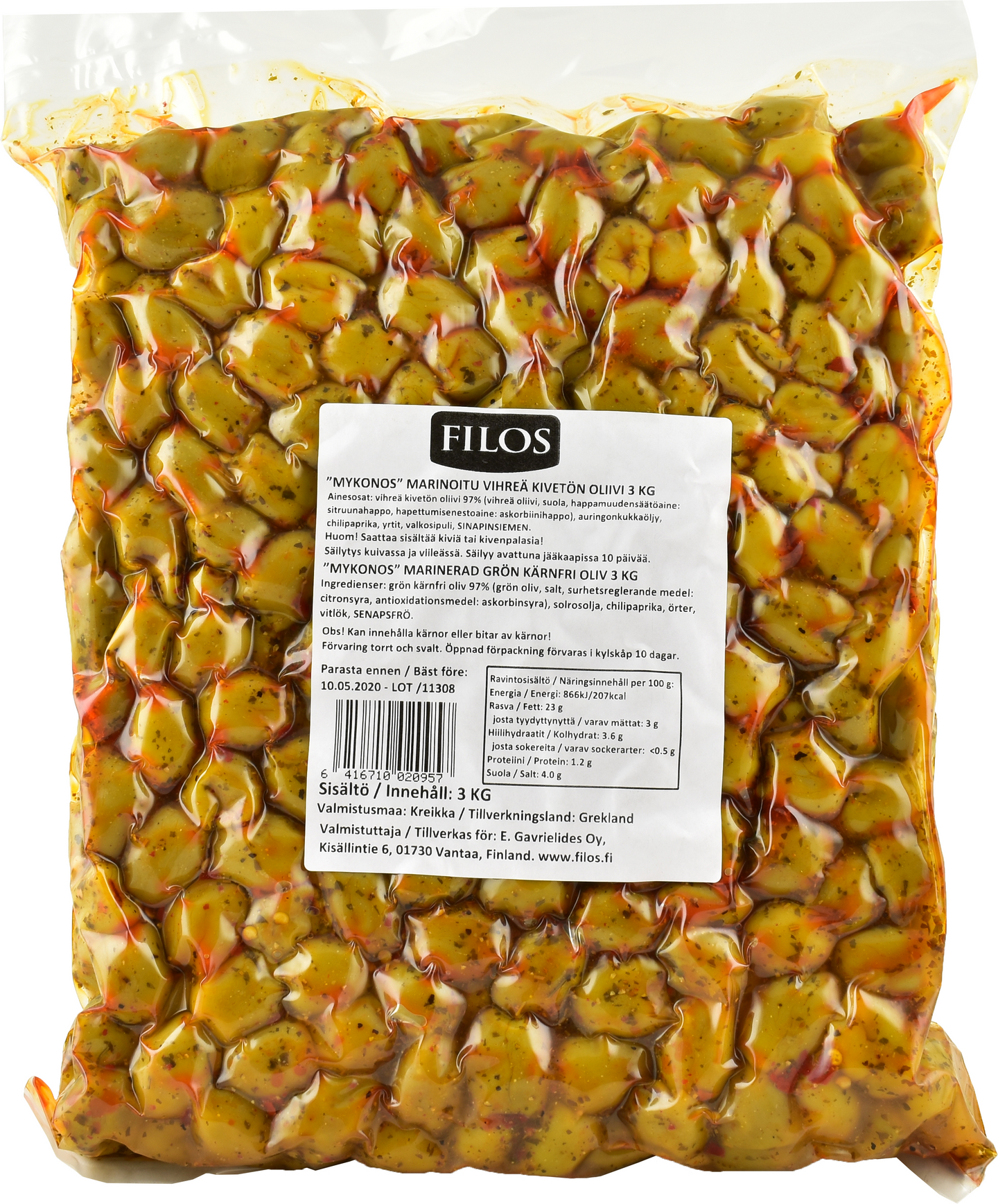 Filos Mykonos marinoitu vihreä kivetön oliivi pussissa 3kg
