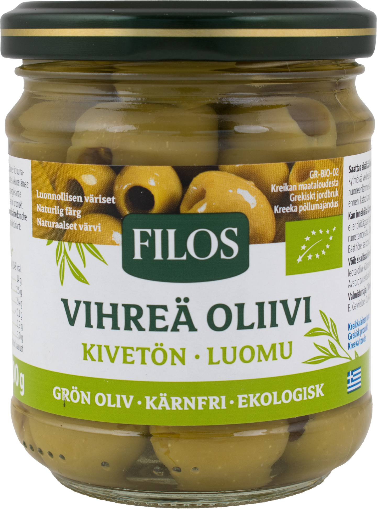 Halkidiki-luomuoliivi, vesi, suola, luomuviinietikka, happamuudensäätöaine: sitruunahappo. Pastoröitu tuote. Alkuperämaa: Kreikka.