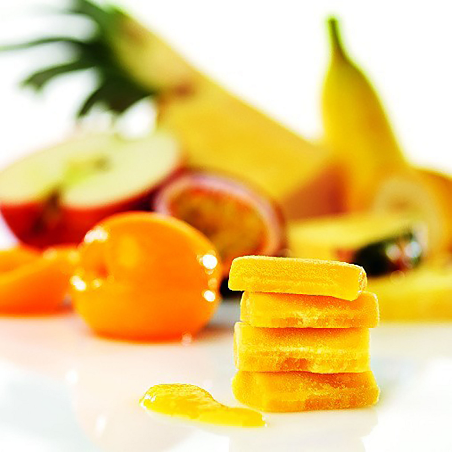 Ananas 32 %, aprikoosi 32 %, omena, banaanipyree, suola, hapettumisenestoaineet (sitruunahappo, askorbiinihappo). Irtopakastettu paloina.