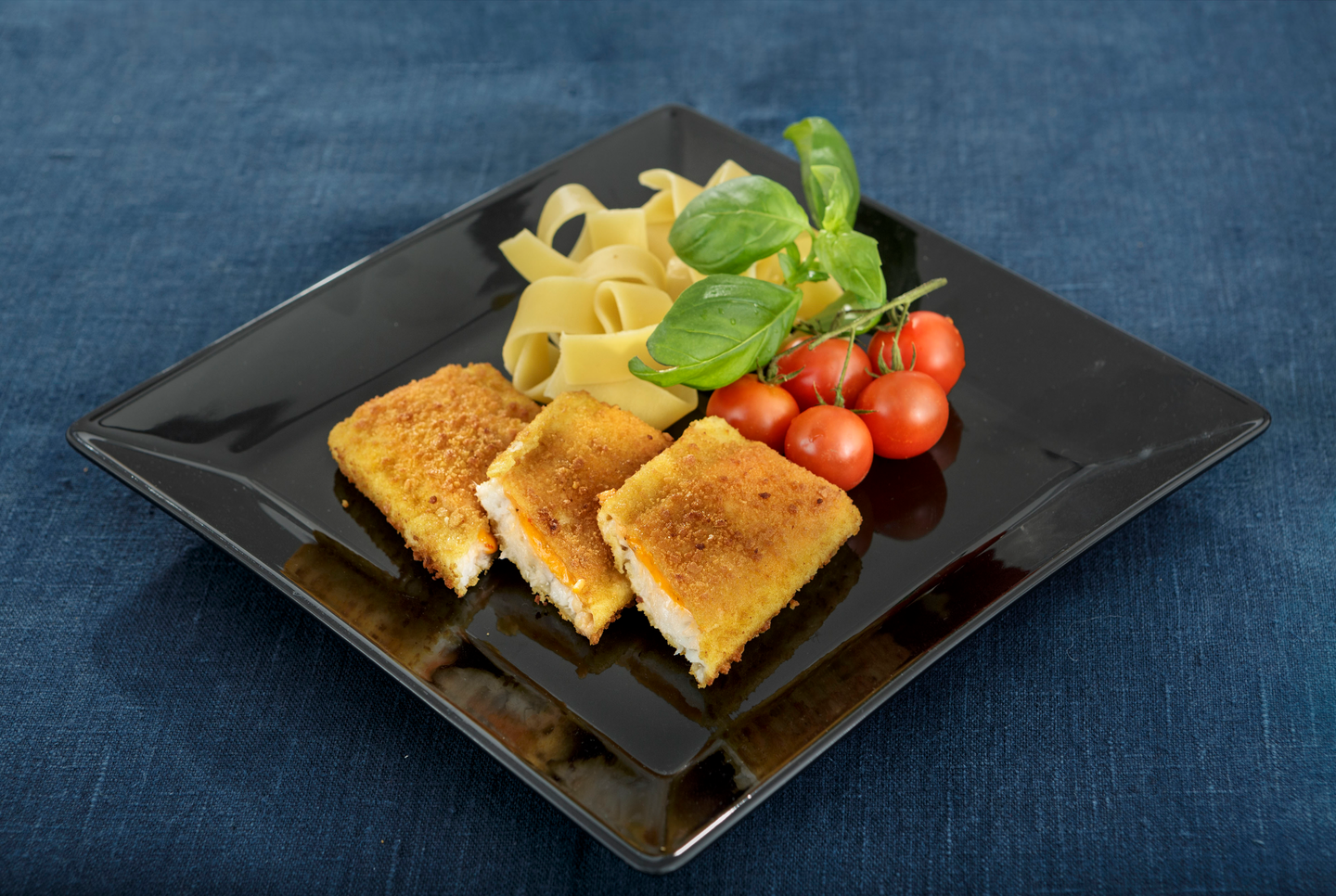 ALASKANSEITI* (Theragra chalcogramma) 50 %, VEHNÄJAUHO, rapsiöljy, vesi, MAITO, tomaatti 2,7 %, mozzarellajuusto 2,5 % (MAITO), riisitärkkelys, rasvaton MAITOJAUHE, tomaattipyree, suola, riisijauho, KANANMUNANVALKUAISJAUHE, hiiva, herajauhe (MAITO), KANANMUNAJAUHE, mausteet, KANANMUNANKELTUAISJAUHE, valkosipuli, juusto (sis. MAITO, KANANMUNA), sokeri, yrtit. *Pyydetty koilliselta tai luoteiselta Tyyneltämereltä.