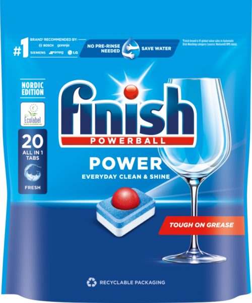 Finish Power -tabletit, all-in-1-ratkaisu astioille. Powerball-ainesosilla tabletista tulee tehopakkaus, jolla saat puhtautta ja kirkkautta jokaiseen päivään – ensimmäisellä kerralla, joka kerta.