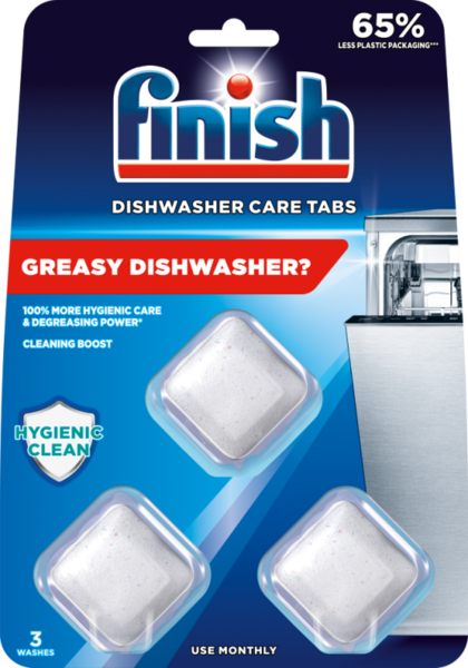 Uusi Finish pesuohjelman aikana puhdistava koneenpuhdistustabletti sisältää 100 % enemmän rasvaa poistavia aktiivisia ainesosia.* Et tarvitse erillistä pesuohjelmaa. Pesuohjelman aikana puhdistava koneenpuhdistustabletti irrottaa tehokkaasti rasvan ja kertyneen lian koneen näkymättömissä olevista osista, kuten suihkuvarsista ja suodattimista samalla, kun astianpesukoneesi pesee astiat. Käytä tablettia kerran kuussa Finish-konetiskitablettien kanssa.