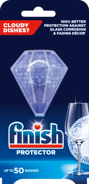 Korkeat pesulämpötilat, pitkät pesuohjelmat ja astianpesukoneessa kiertävä erittäin pehmeä vesi kuluttavat lasien ja koristeiden pintaa. Tällaisissa vaativissa olosuhteissa astioiden suojausta varten tarvitaan enemmän suoja-aineita. Finish Protectorin ainutlaatuinen teknologia mukautuu olosuhteisiin – tarvittaessa kide liukenee nopeammin, jolloin Finish Protector voi olla tarpeen vaihtaa jo ennen kuin sitä on käytetty täydet 50 pesukertaa. ** Lasin korroosion ja koristeen himmenemisvaurion aste riippuu (muun muassa) astian tyypistä ja pesuprosessin aikaisista olosuhteista. Käsin maalatut, kullatut tai antiikkiastiat eivät kestä korkeaa pesulämpötilaa astianpesukoneessa, ja siksi nämä astiat voivat vahingoittua, vaikka koneessa käytettäisiinkin Finish Protectoria. Finish Protector ei estä hilseilyä tai mekaanisia vaurioita, kuten naarmuuntumista, halkeilua tai pintasäröilyä.