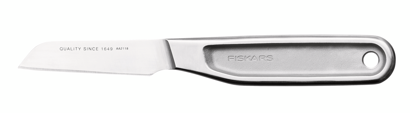 Fiskars All Steel -kuorimaveitsi (7 cm) on valmistettu korkealaatuisesta ruostumattomasta teräksestä. Suorituskyvyltään erinomainen veitsi on suunniteltu kestämään käyttöä ja aikaa. Sen kestävä ja kompakti terä sopii pienten hedelmien ja vihannesten kuorimiseen ja leikkaamiseen. Japanilainen hiiliteräs tekee veitsestä erittäin kestävän, ja sen saumaton, valettu rakenne on tyylikkään ajaton. Veitsen täydellisen tasapainon ansiosta leikkaaminen on luontevaa ja mukavaa. Suositellaan pestäväksi käsin. Suunniteltu Suomessa.