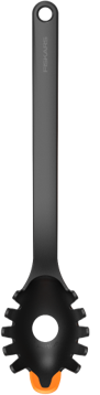 Functional Form tarjoaa toimivia ja käytännöllisiä välineitä arjen ruoanlaittoon. Sarjan kaikki osat ovat helppoja käyttää, puhdistaa ja säilyttää. Functional Form -pastakauha soveltuu spagetin, nauhapastan ja nuudeleiden valmistukseen ja tarjoiluun. Silikonipinnoitettu kärki pyyhkii kastikkeen tarkasti pastakattilasta. Kauhan keskellä on annosmitta yhdelle hengelle, joten saat aina sopivan kokoisen annoksen pastaa. Konepesun kestävä.
