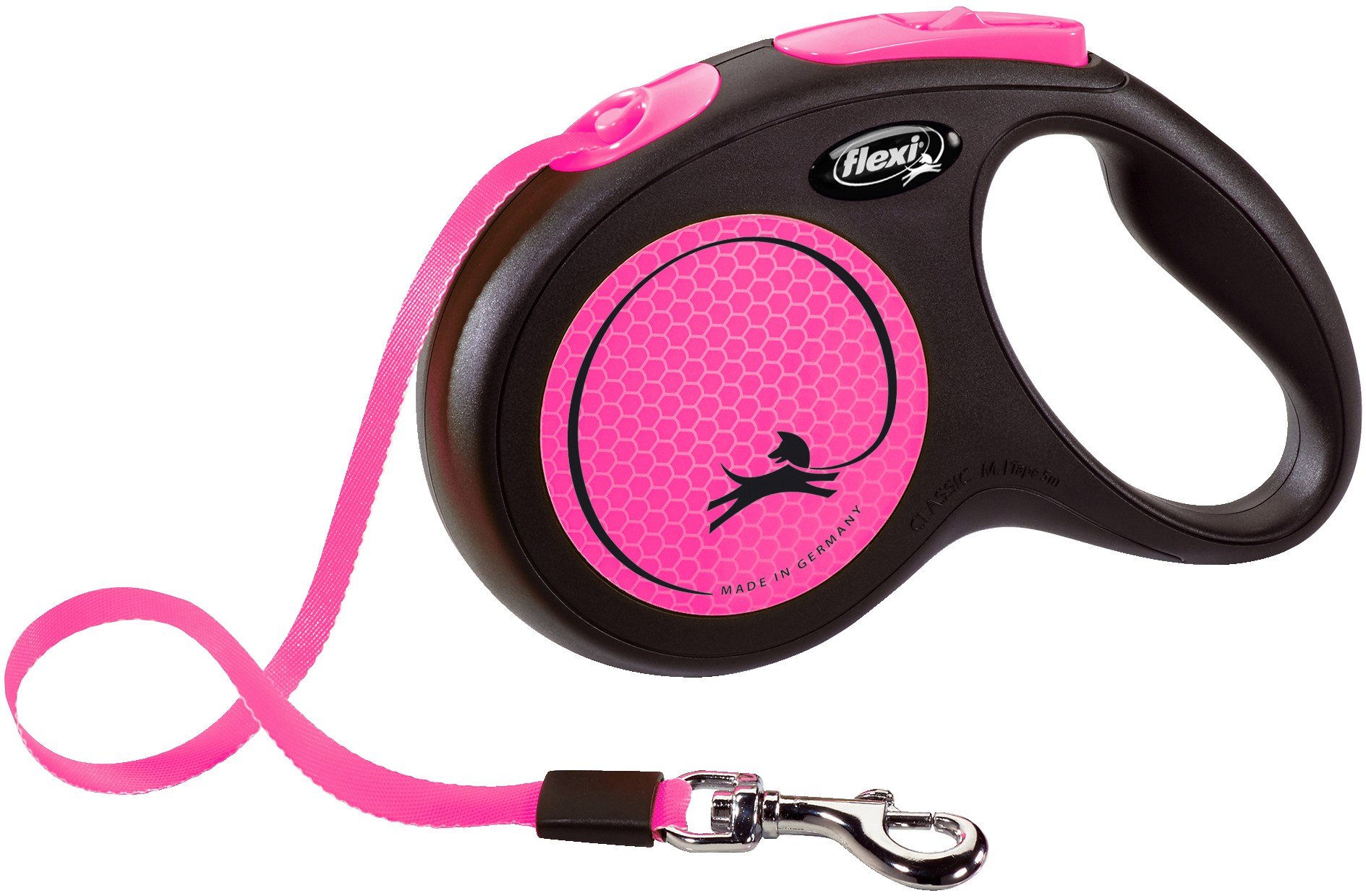 Flexi New Neon -taluttimessa on uusi jarrumekanismi, joka toimii nopeasti ja varmasti - juuri silloin kuin sen pitääkin. Innovatiivinen nauhanohjuri huolehtii, ettei hihna jumitu ja aiheuta kiusallisia tilanteita. Neonpinkki nauha ja heijastimet taluttimen sivuilla erottuu hyvin pimeässä kaukaakin. Painoraja max 25 kg.