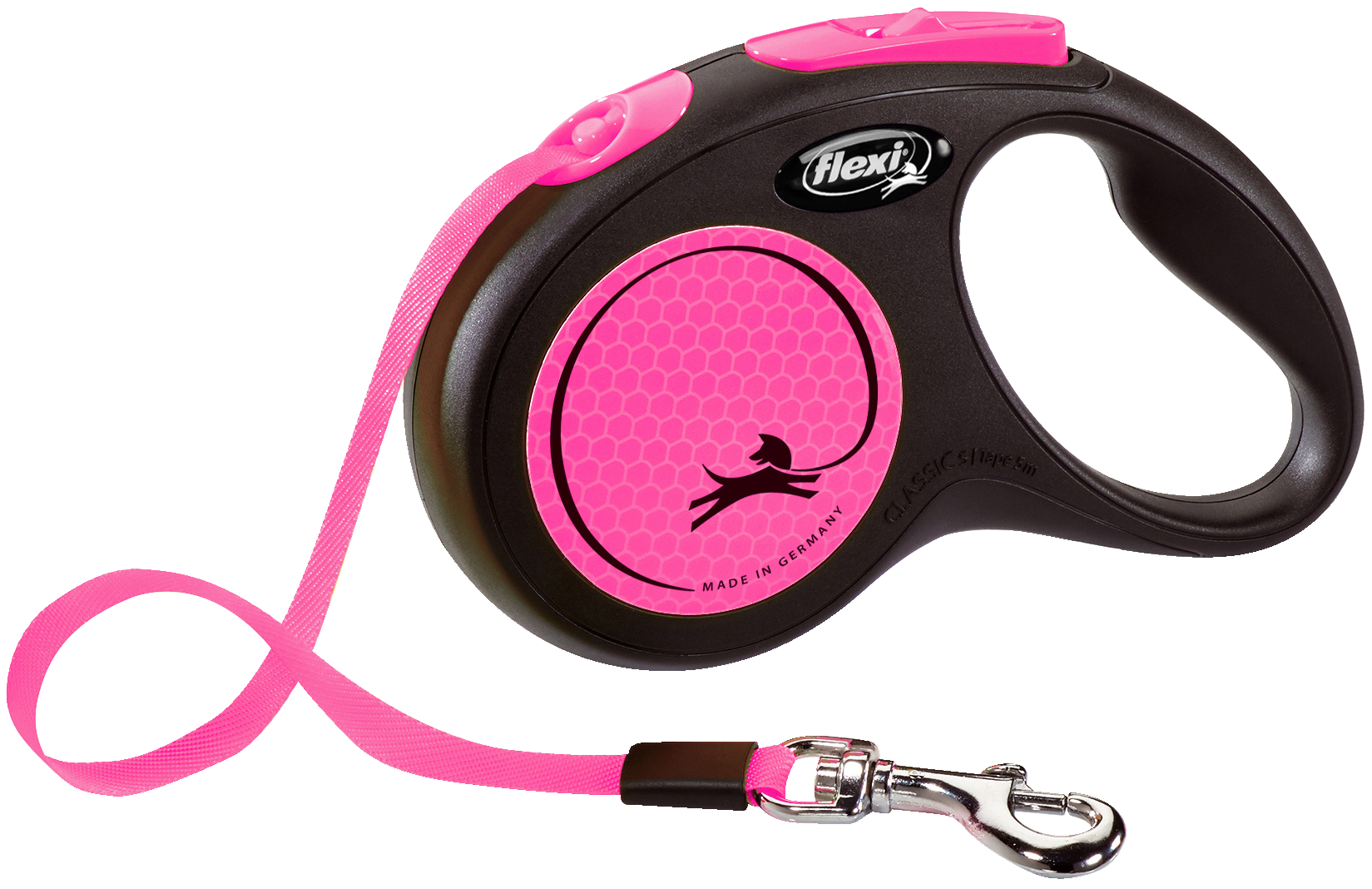 Flexi New Neon -taluttimessa on uusi jarrumekanismi, joka toimii nopeasti ja varmasti - juuri silloin kuin sen pitääkin. Innovatiivinen nauhanohjuri huolehtii, ettei hihna jumitu ja aiheuta kiusallisia tilanteita. Neonpinkki nauha ja heijastimet taluttimen sivuilla erottuu hyvin pimeässä kaukaakin. Painoraja max 15 kg.