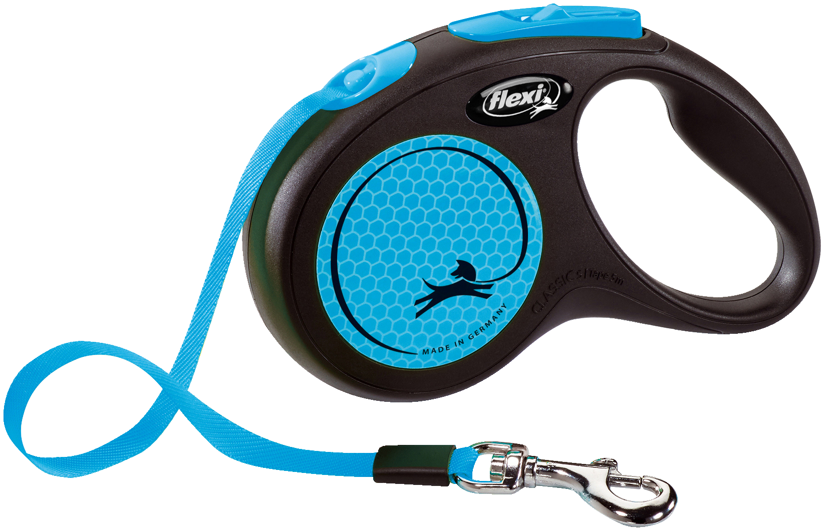 Flexi New Neon -taluttimessa on uusi jarrumekanismi, joka toimii nopeasti ja varmasti - juuri silloin kuin sen pitääkin. Innovatiivinen nauhanohjuri huolehtii, ettei hihna jumitu ja aiheuta kiusallisia tilanteita. Neonsininen nauha ja heijastimet taluttimen sivuilla erottuu hyvin pimeässä kaukaakin. Painoraja max 15 kg.