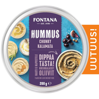 Aito kreikkalainen hummus mehukkailla kalamataoliiveilla. Valmistettu perinteiseen kreikkalaiseen tapaan kikherneistä. Raikkaan sileä koostumus, sopii täydellisesti dippailuun ja monipuolisesti ruoanlaittoon.
