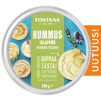 Aito kreikkalainen hummus miedon tulisella jalapenolla. Valmistettu perinteiseen kreikkalaiseen tapaan kikherneistä. Raikkaan sileä koostumus, sopii täydellisesti dippailuun ja monipuolisesti ruoanlaittoon.
