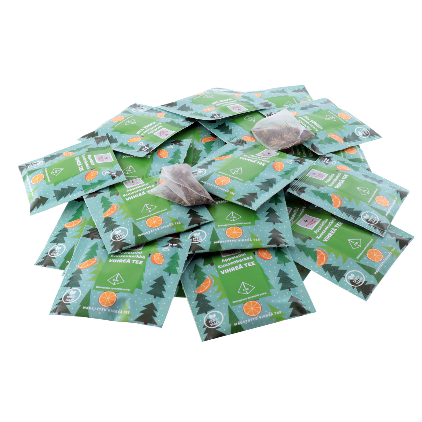 Vihreä tee on maustettu appelsiinilla ja Lapin kerkällä. Pyramidipusseilla valmistat teen helposti! Pussit on valmistettu 100% biohajoavista luonnonkuiduista.