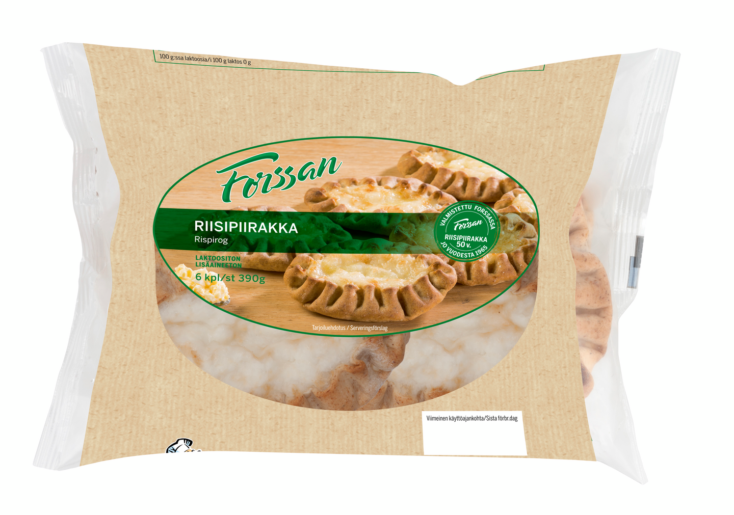 LaktoositonPerinteinen riisipiirakka on valmistettu rypytetystä ruis- ja vehnäjauhokuoresta, jonka sisässä on herkullinen riisipuurotäyte. Riisipiirakka on mainio välipala, jonka voi nauttia esimerkiksi munavoin, juuston, tuorejuuston tai kinkun kanssa. Forssan riisipiirakat ovat laktoosittomia. Riisipiirakat voi syödä kylminä, mutta ne ovat parhaimmillaan lämmitettynä. Rapeaksi piirakat lämpenevät uunissa, mutta ne voi myös lämmittää mikroaaltouunissa.