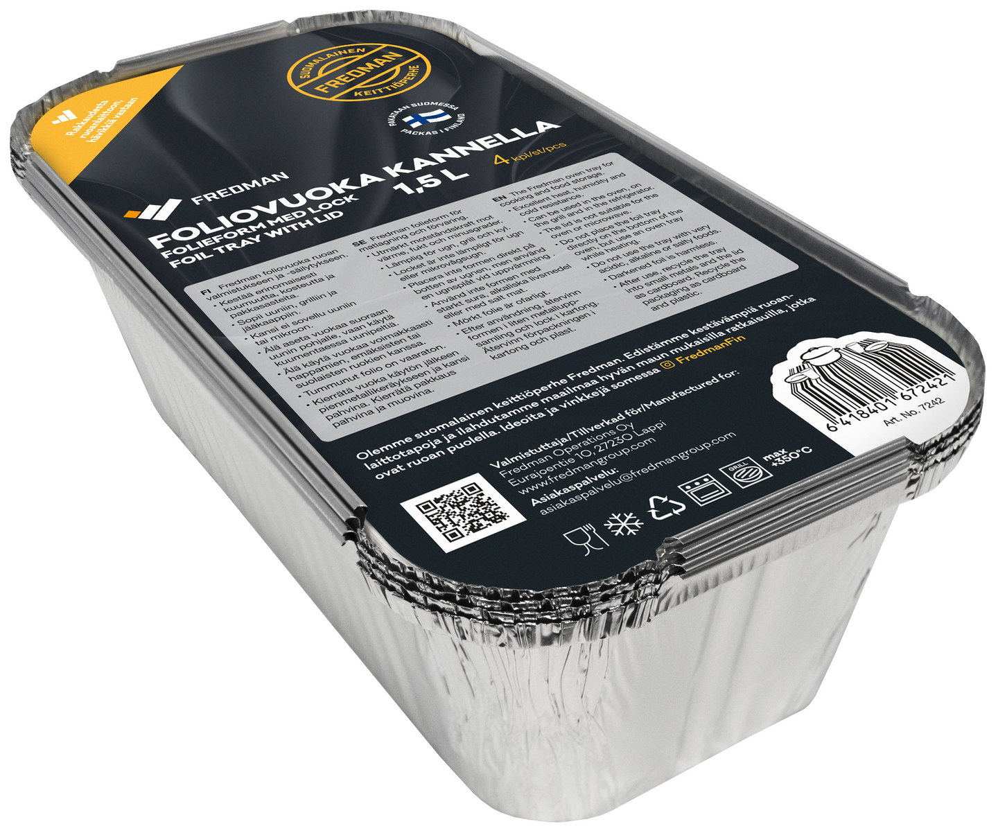 Fredmanin alumiinifoliovuoat soveltuvat paistosten ja laatikkoruokien paistamiseen, pakastukseen ja tarjoiluun. Voit säilyttää niissä myös einestuotteita.
