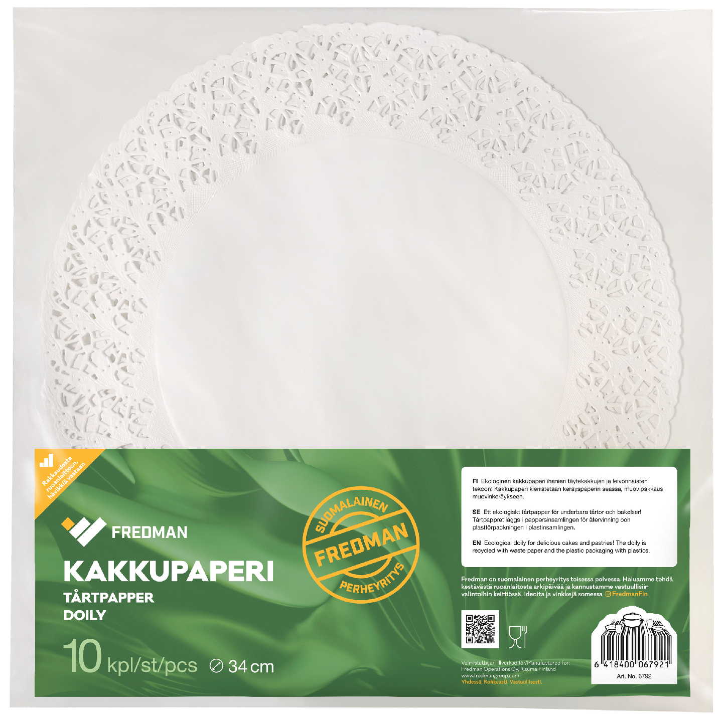Fredman kakkupaperilla tarjoilet luomuksesi näyttävästi. Pakkaus sisältää 10 kappaletta halkaisijaltaan 34cm kakkupapereita.