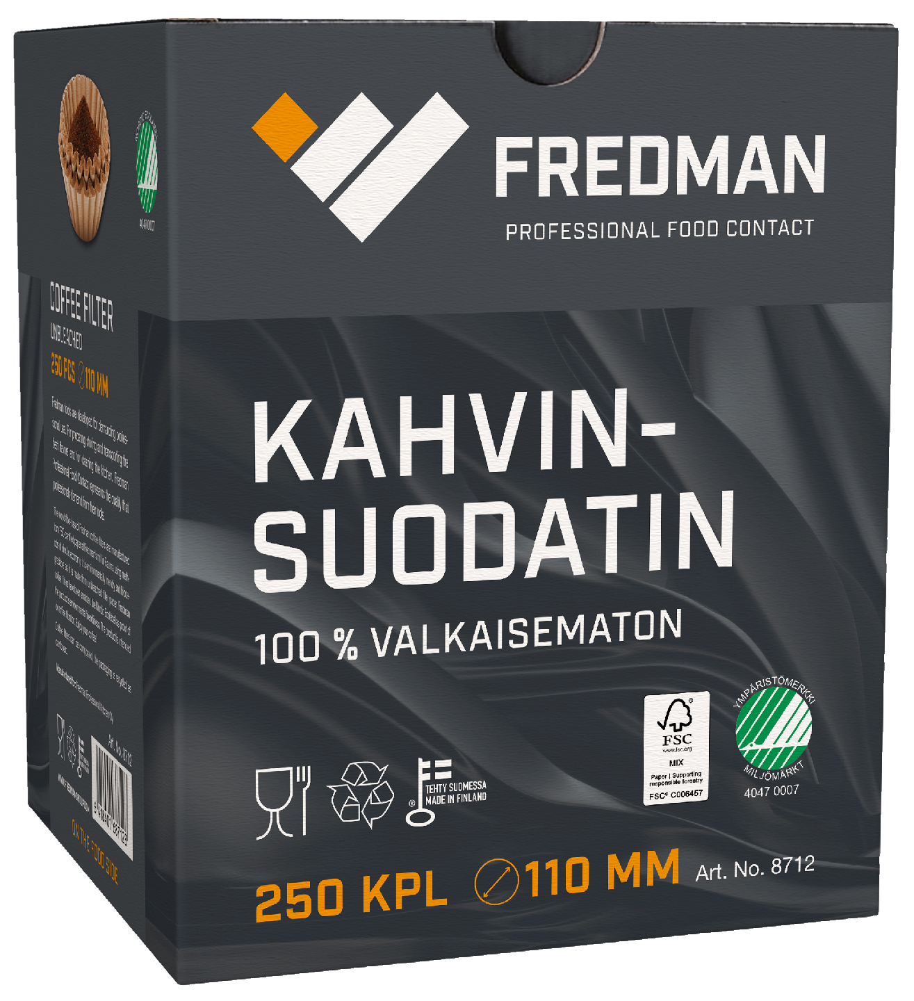 Kotimainen, puukuitupohjainen Fredman kahvinsuodatin. Luontoystävällinen ja biohajoava suodatin on valmistettu FSC-sertifioidusta, valkaisemattomasta paperista Fredmanin tehtaalla Raumalla kiertotalousmenetelmin. Fredman suodatinpusseille on myönnetty Joutsenmerkki osoituksena tuotteen ympäristöystävällisyydestä.
