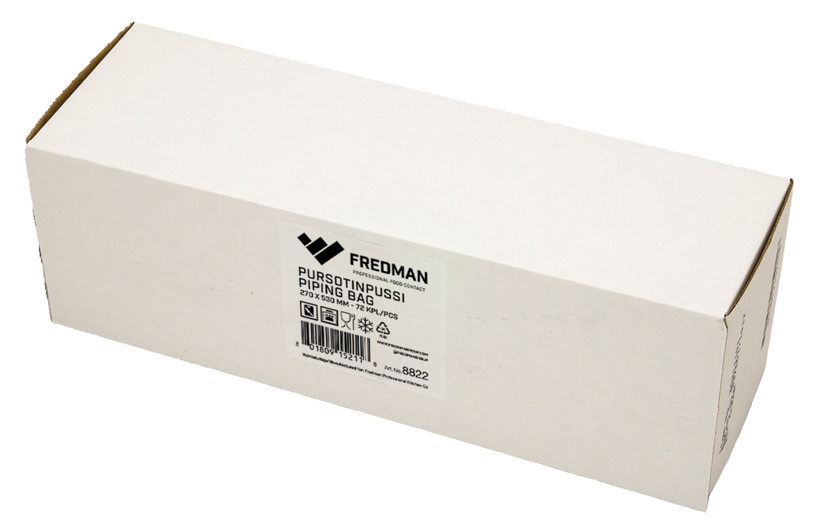 Kestävät ja laadukkkaat Fredmanin pursotinpussit tunnetaan steriilistä sisäosasta, vahvoista tuplasaumoista ja työtä helpottavasta karkeahkosta tartuntapinnasta. Voit käyttää pursotinpussia koristelun ja leivonnan lisäksi ruoan valmistamisessa.