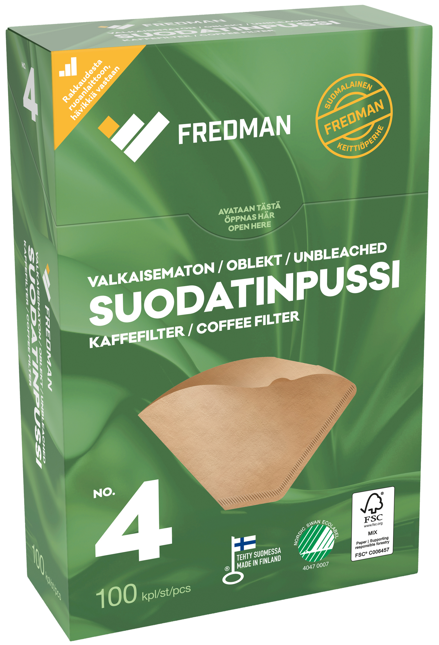 Fredman suodatinpussi valmistetaan kiertotalousmenetelmin valkaisemattomasta paperista Suomessa. Suodatinpusseihin käytetty FSC-sertifioitu paperi valmistetaan vastuullisesti hoidetuista metsistä saadusta puusta.