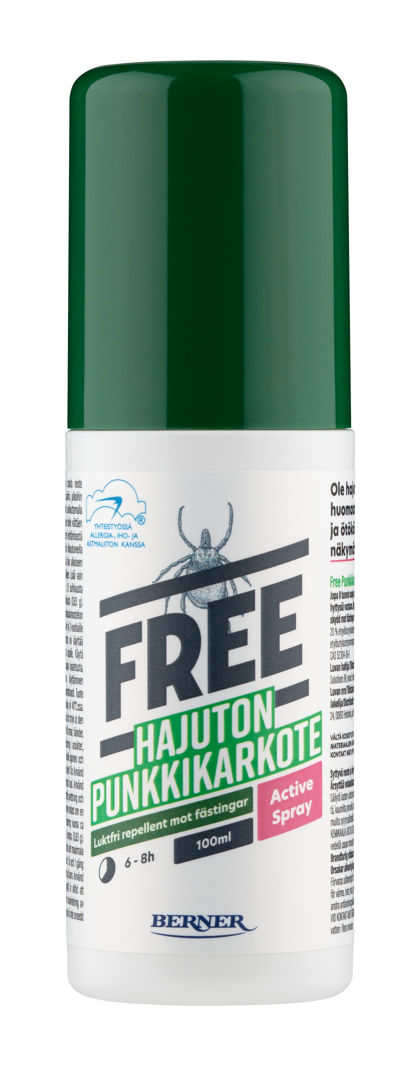 Hajuton ja tehokas Free Punkkikarkote karkottaa punkit iholta ja suojaa myös hyttysiltä. Jopa 8 tunnin suoja punkkeja vastaan. Yhteistyössä Allergia-, Iho- ja Astmaliiton kanssa.