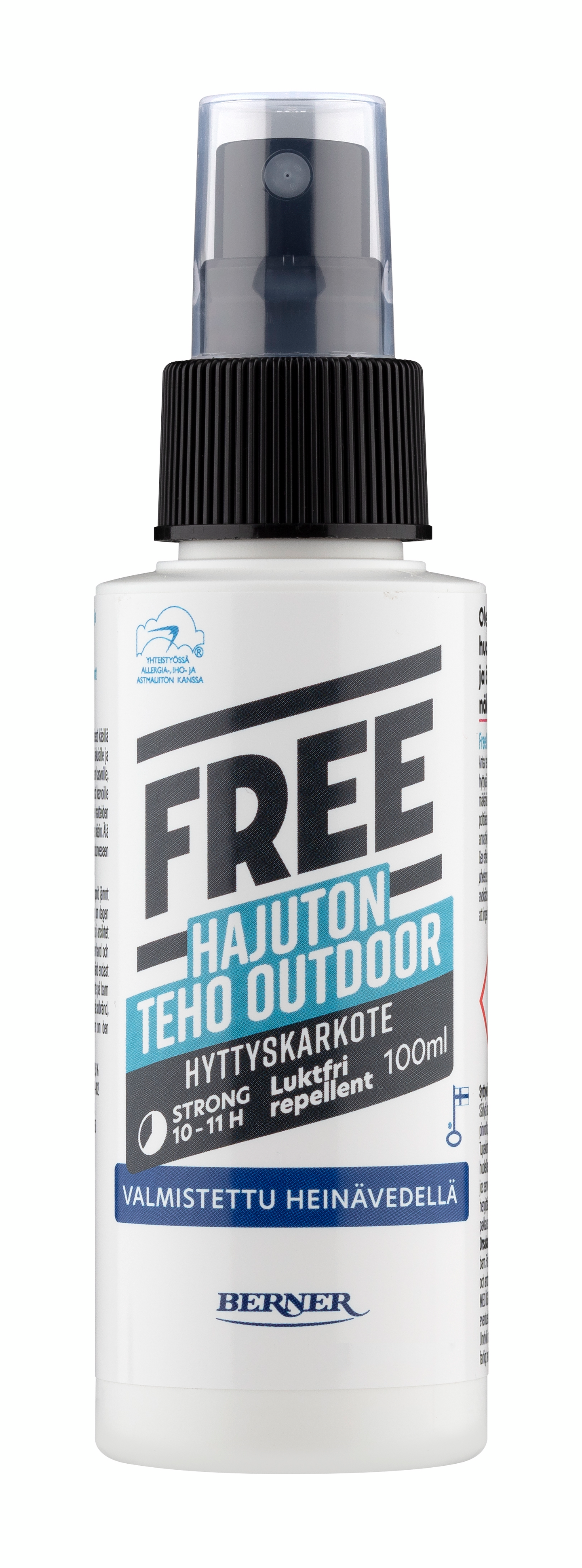 Free Teho Outdoor hajuton hyttyskarkote antaa tehokkaan 10-11 tunnin suojan hyttysiä, punkkeja ja paarmoja vastaan. Antaa suojan myös trooppisia hyttysiä vastaan.