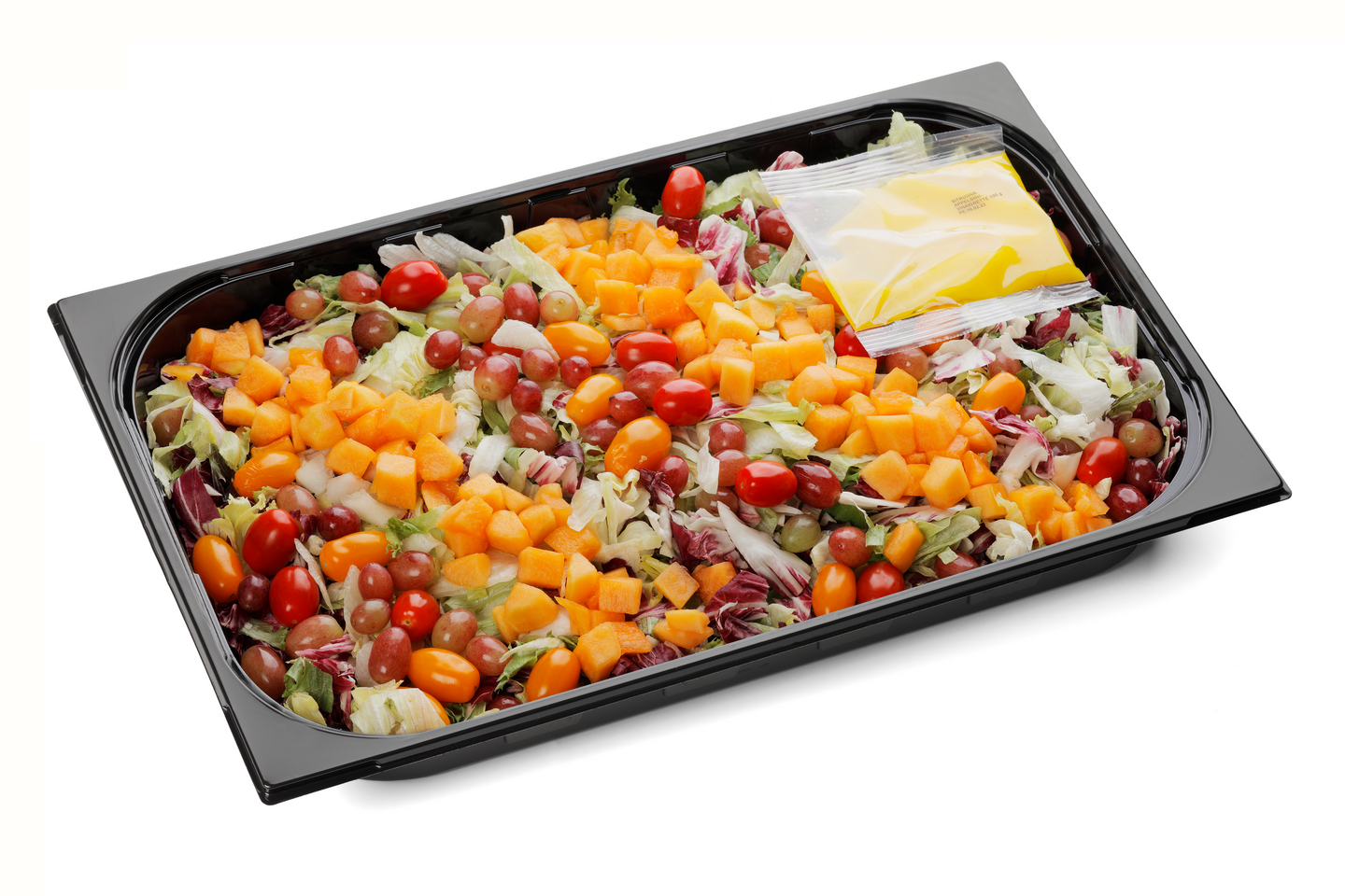 Salaattisekoitus (jäävuori-, puna- ja jääsalaatti), cantaloupe-meloni, tomaatti, viinirypäle. Sitruuna-appelsiinivinegrette 100 g: rapsiöljy, vesi, valkoviinietikka (sis. SULFIITTIA), sokeri, sitruunatäysmehu (tiivisteestä), vaalea balsamietikka (sis. SULFIITTIA), appelsiinitäysmehutiiviste, väri (E160a), sitruuna-aromi, suola, limetäysmehutiiviste, appelsiiniaromi, sakeuttamisaine (E415), säilöntäaine (E202), valkopippuri
