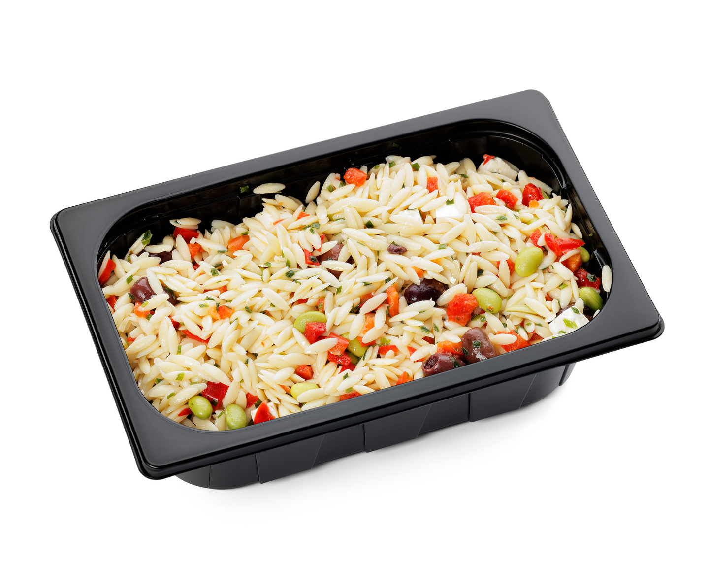 Pasta 54% (vesi, DURUMVEHNÄ), SOIJAPAPU, paprika, oliivi (Kalamata-oliivi, suola, viinietikka), salaattijuusto (pastöroitu MAITO, suola), rypsiöljy, valkoviinietikka (sis. SULFIITTEJA), ruohosipuli, sokeri, sitruunatäysmehu, väkiviinaetikka, suola