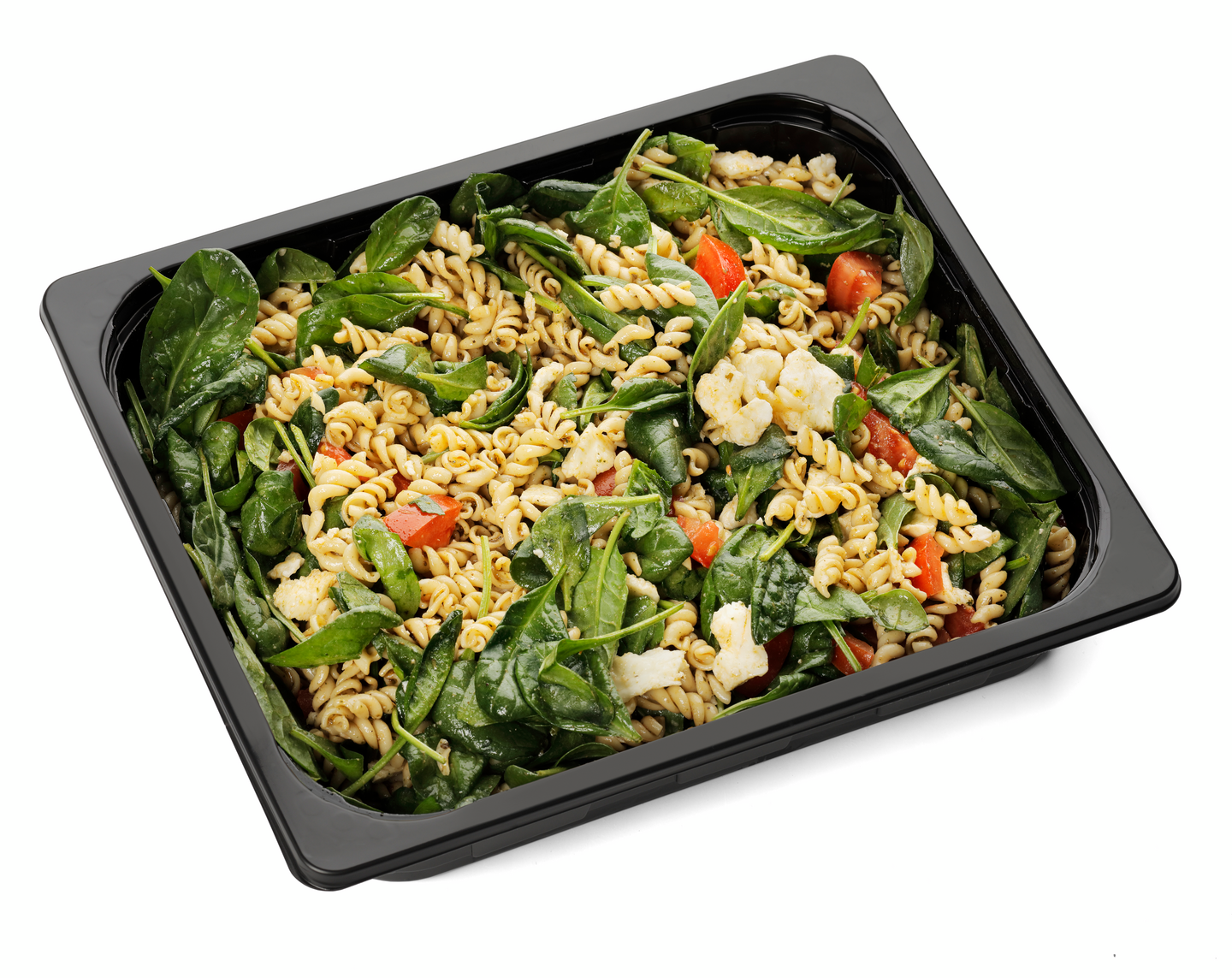 Maustettu pasta 63 % (pasta (vesi, DURUMVEHNÄJAUHO), pestokastike (basilika, rapsiöljy, oliiviöljy, auringonkukansiemen, vaalea balsamietikka (viinietikka, rypälemehutiiviste), suola, valkosipuli, sokeri, mustapippuri, JUUSTOAROMI, happamuudensäätöaineet (E330, E300), muunnettu maissitärkkelys, säilöntäaineet (E202, E211)), mausteöljy (rapsi- ja oliiviöljy, tomaattipyre, sitruunatäysmehu, aurinkokuivattu tomaatti (tomaatti, auringonkukkaöljy, suola, viinietikka, säilöntäaine (E224 KALIUMDISULFIITTI)), oregano, timjami, persilja)), tomaatti 17 %, halloumijuustomuru 13 % (pastöroitu lehmän-, lampaan- ja vuohenMAITO, suola, juoksute, kuivattu minttu), pinaatti