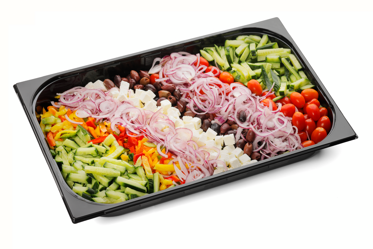 Kurkku, miniluumutomaatti, fetajuusto 15 % (pastöroitu lampaan ja vuohen MAITO, suola, hapate, mikrobiologinen juoksute), kalamata oliivi 10 % (oliivi, vesi, suola, viinietikka, säilöntäaine E202), paprika, punasipuli