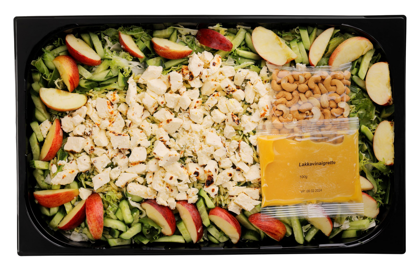 Yrttimaustettu risonipasta (vesi, DURUMVEHNÄJAUHO, ruohosipuli, sitrusvinegretti (rapsiöljy, valkoviinietikka, vesi, sokeri, hunaja, ekstraneitsytoliiviöljy, sitruunamehutiiviste, mandariinimehutiiviste, sitruunankuori, sakeuttamisaineet (E407, E415), aromit, jalopeno), persilja, suola, sitrusmausteseos), leipäjuusto 18 % (pastöroitu MAITO, suola, happamuudensäätöaine (E509)), omena (sis. hapettumisenestoaine (E302)), kurkku, salaattisekoitus (frisee- ja jääsalaatti).
