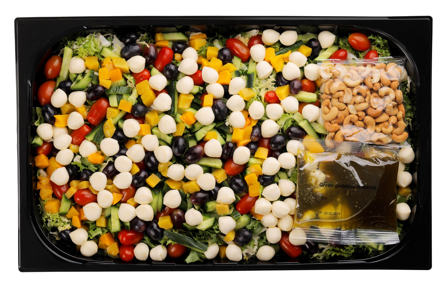Frisee- ja jääsalaatin yhdistelmä tuo raikkautta lautaselle. Mozzarellajuuston (25 %) täyteläisyys yhdistyy tuoreisiin kurkkusuikaleisiin ja makeisiin miniluumutomaatteihin. Persikkasäilyke ja tummat viinirypäleet tuovat makuvivahteita, kun taas paahdetut, suolaiset cashewpähkinät tarjoavat rouskuvaa koostumusta. Green Goddess -kastike viimeistelee tämän herkullisen yhdistelmän.
