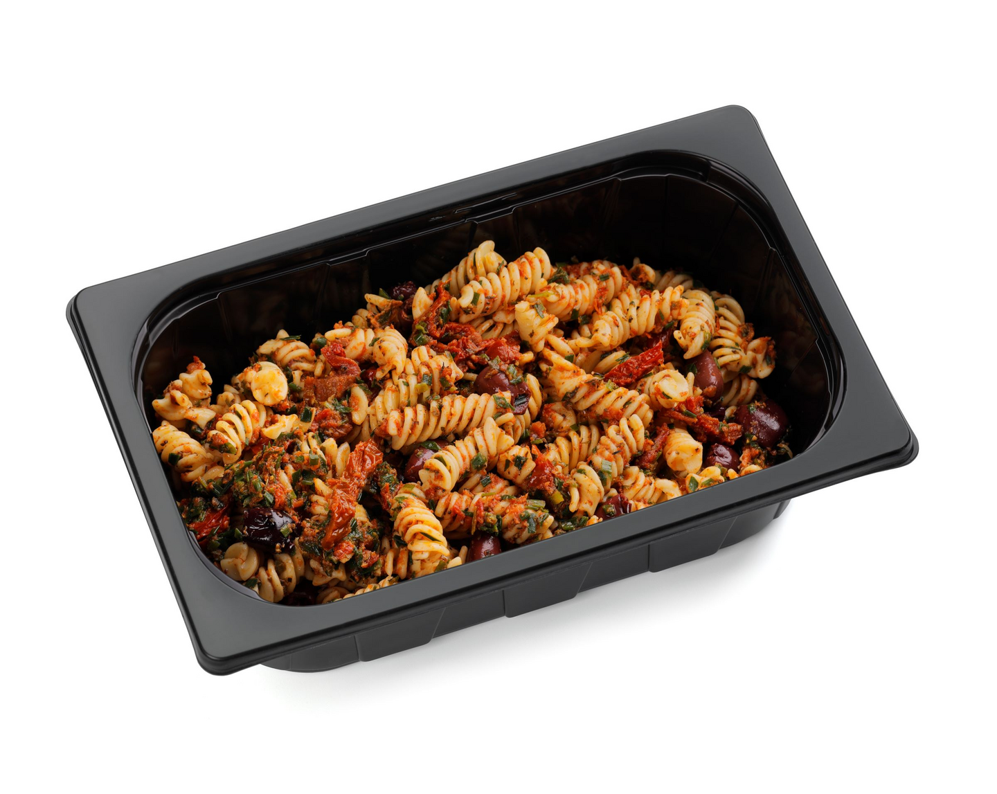 Pasta (vesi, DURUMVEHNÄJAUHO), mausteöljy (rapsiöljy, oliiviöljy, tomaattipyre, sitruunatäysmehu (tiivisteestä), sokeri, valkosipuli, suola, oregano, mustapippuri, basilika, timjami, persilja, säilöntäaine (E202)), aurinkokuivattu tomaatti (tomaatti, auringonkukkaöljy, sokeri, suola, viinietikka, happamuudensäätöaine (E270), hapettumisenestoaine (E300), säilöntäaine (KALIUMDISULFIITTI)), kalamataoliivi (oliivi, vesi, suola, etikka), ruohosipuli