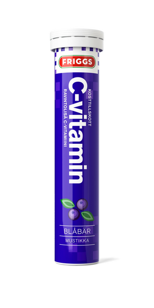 Friggs C-vitamiini Mustikka poretabletit ovat sokerittomia ja nopeasti liukenevia. 1 tabletti sisältää 1g C-vitamiinia. C-vitamiini on tärkeä vitamiini, joka suojaa elimistön soluja. Se edistää mös raudan imeytymistä, on hyväksi iholle, luustolle, hampaille ja verisuonille sekä edistää immuunijärjestelmän normaalia toimintaa.