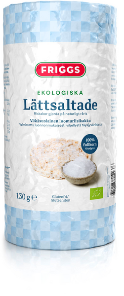 GluteenitonFriggs Luomu Riisikakku Vähäsuolainen ovat kevyesti suolattuja, luonnollisesti gluteenittomia ja runsaasti täysjyvää sisältäviä riisikakkuja. Sopii välipalaksi sellaisenaan tai suosikkitäytteilläsi päällystettyinä.