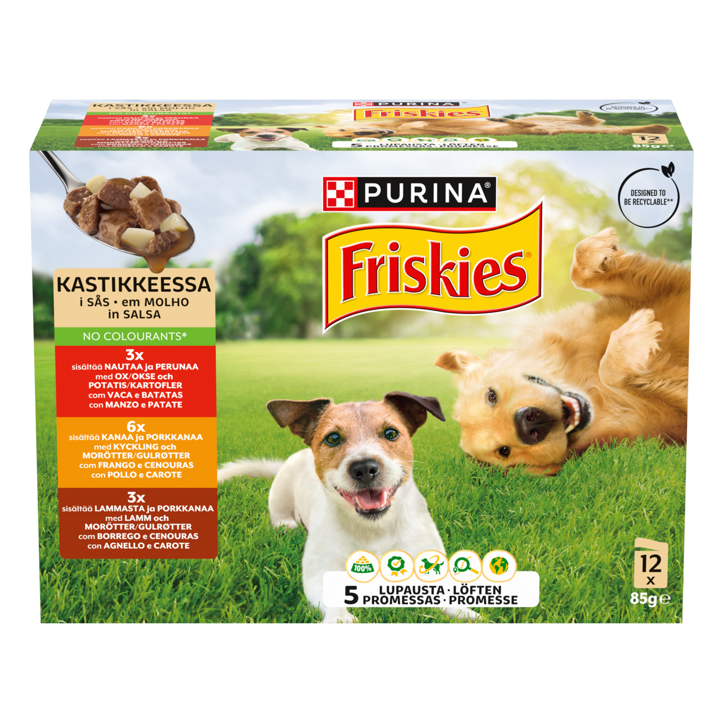 Friskies 12x85g adult nautaa, lammasta ja kanaa kastikkeessa lajitelma 3 varianttia