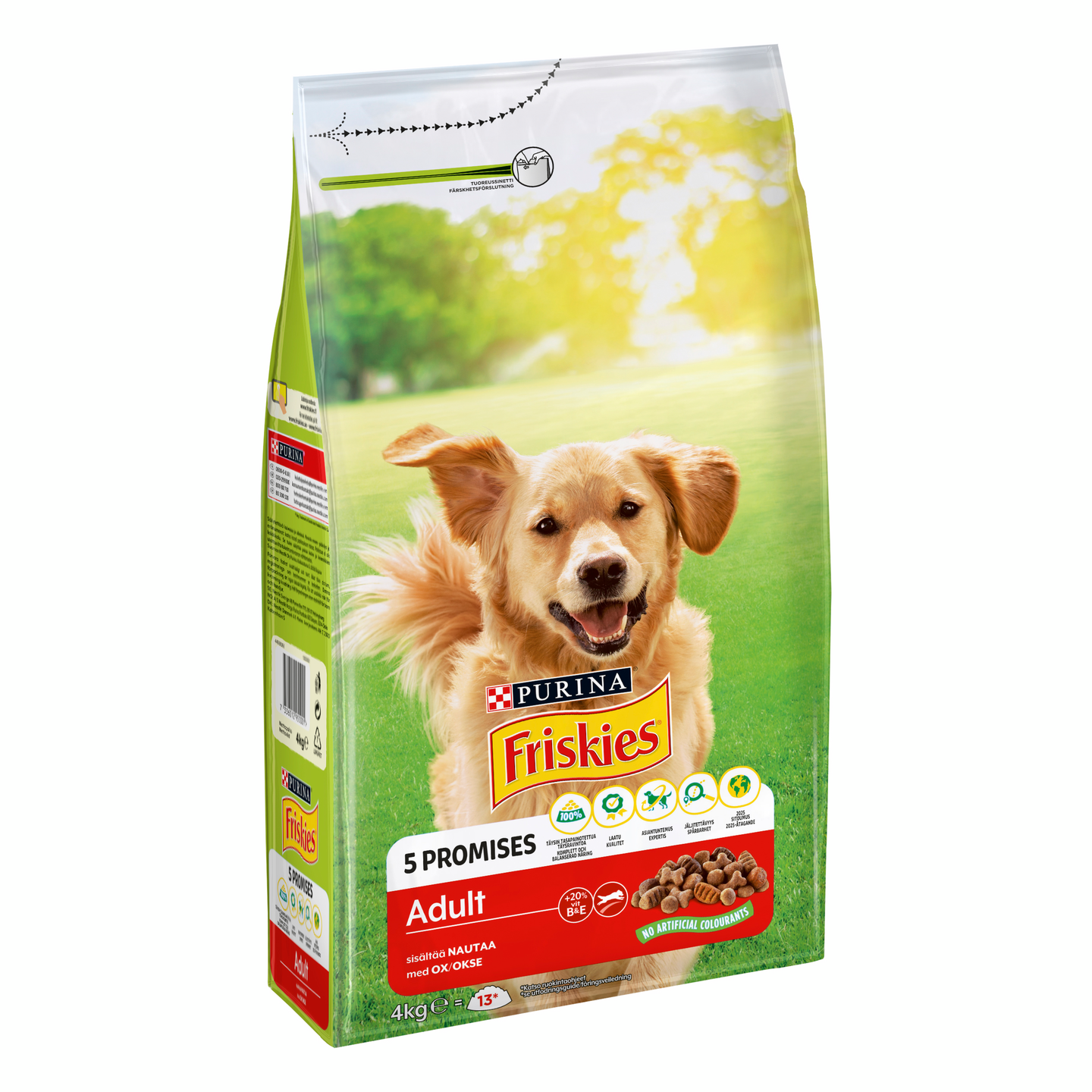 Sisältää nautaa. FRISKIES Adult Runsaasti Lihaa on 100 % tasapainoinen täysravinto, joka on suunniteltu perheen energisille ja aina leikkisille koirille! Sisältää korkealuokkaista proteiinia ylläpitämään hyvää ruumiillista kuntoa sekä 100% ravintoaineista, joita koirasi tarvitsee päivittäin.
