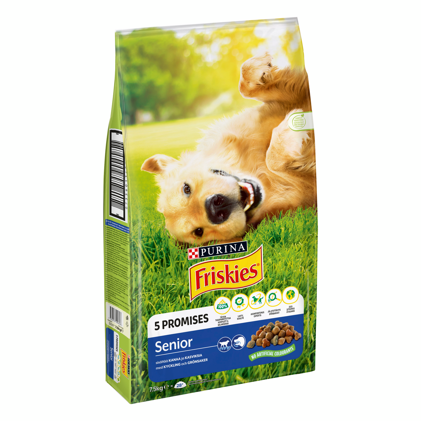 "PURINA® Friskies® Senior -kuivaruoka on tarkoitettu yli 7-vuotiaille koirille. Maukasta kanaa ja kasviksia sisältävä ruoka on täyttä ja tasapainoista ravintoa, joka on kehitetty erityisesti auttamaan pitämään koirasi nivelet terveinä ja tukemaan koiran liikkuvuutta.