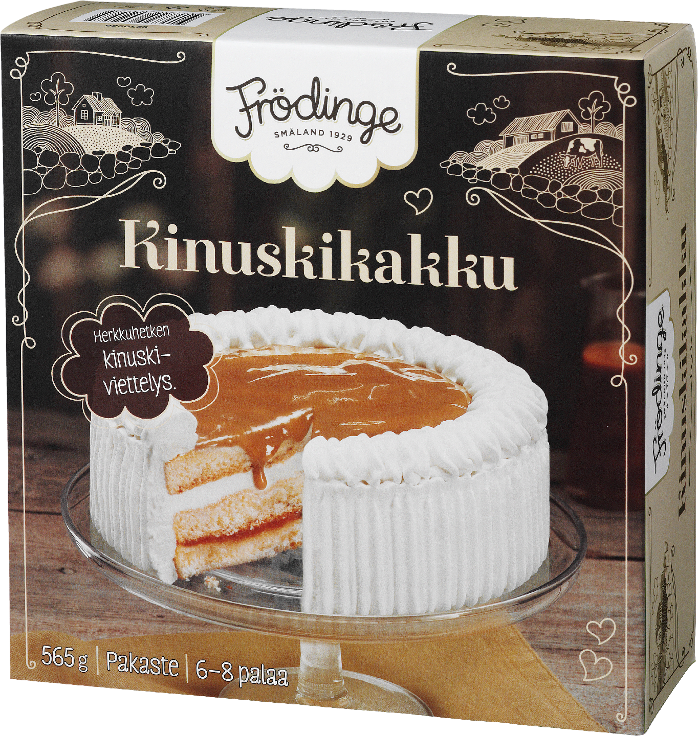 Frödinge® kinuskikakku on täydellisen herkkuhetken kinuskiviettelys. Siinä on mehevä kakkupohja, jonka täytteenä on maukasta kinuskikastiketta ja kermavaahtoa. Päällä on lisää ihanaa kinuskikastiketta ja reunat on koristeltu juhlavasti kermavaahtopursotuksin. Frödinge kinuskikakku on helppo ja nopea kahvipöydän tarjottava niin arkeen kuin juhlaan. Pakastekakku on sellaisenaan käyttövalmis: poista vain pakkaus ja sulata huoneenlämmössä muovikupu päällä noin 3 h tai jääkaapissa noin 5 h. Kakusta tulee noin 6-8 annosta.