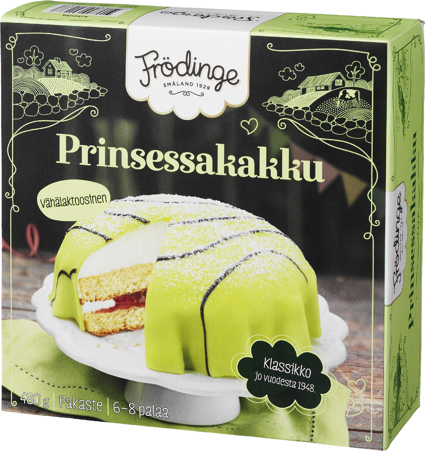 Klassinen prinsessakakku jo vuodesta 1948. Frödinge® prinsessakakussa on mehevä kakkupohja, jonka täytteenä on raikasta vadelmaa ja vaniljaista kermavaahtoa. Päällä on ohut ja maukas marsipaanikuorrute, joka on koristeltu tomusokerilla ja suklaaraidoilla. Vähälaktoosinen Frödinge prinsessakakku on helppo ja nopea kahvipöydän tarjottava niin arkeen kuin juhlaan. Pakastekakku on sellaisenaan käyttövalmis: poista vain pakkaus ja sulata huoneenlämmössä muovikupu päällä noin 3 h tai jääkaapissa noin 5 h. Kakusta tulee noin 6-8 annosta.