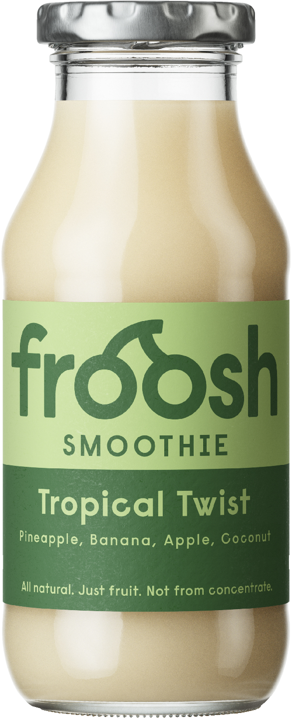 VegaaninenFroosh hedelmäsmoothie. Froosh Tropical Twist on trooppisen herkullinen yhdistelmä makeaa banaania, ananasta ja kookosvettä. Täydellinen välipala tilanteeseen kuin tilanteeseen. Smoothie on valmistettu luonnollisista aineksista, eikä se sisällä lisäaineita. 100% hedelmää.