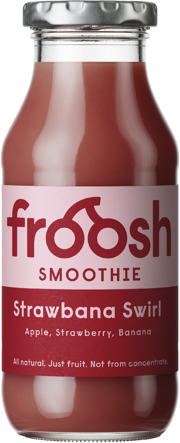 VegaaninenFroosh hedelmäsmoothie. Froosh Strawbana Swirl -smoothie on kuin kesä pakattuna pulloon - makeaa mansikkaa, banaania ja trooppinen lisä guavasta. Täydellinen välipala tilanteeseen kuin tilanteeseen; mukaan tai kotona nautittuna. Aamupalalla, treenin jälkeen tai kun tekee mieli välipalaa. Smoothie on valmistettu luonnollisista aineksista, eikä se sisällä lisäaineita. 100% hedelmää.