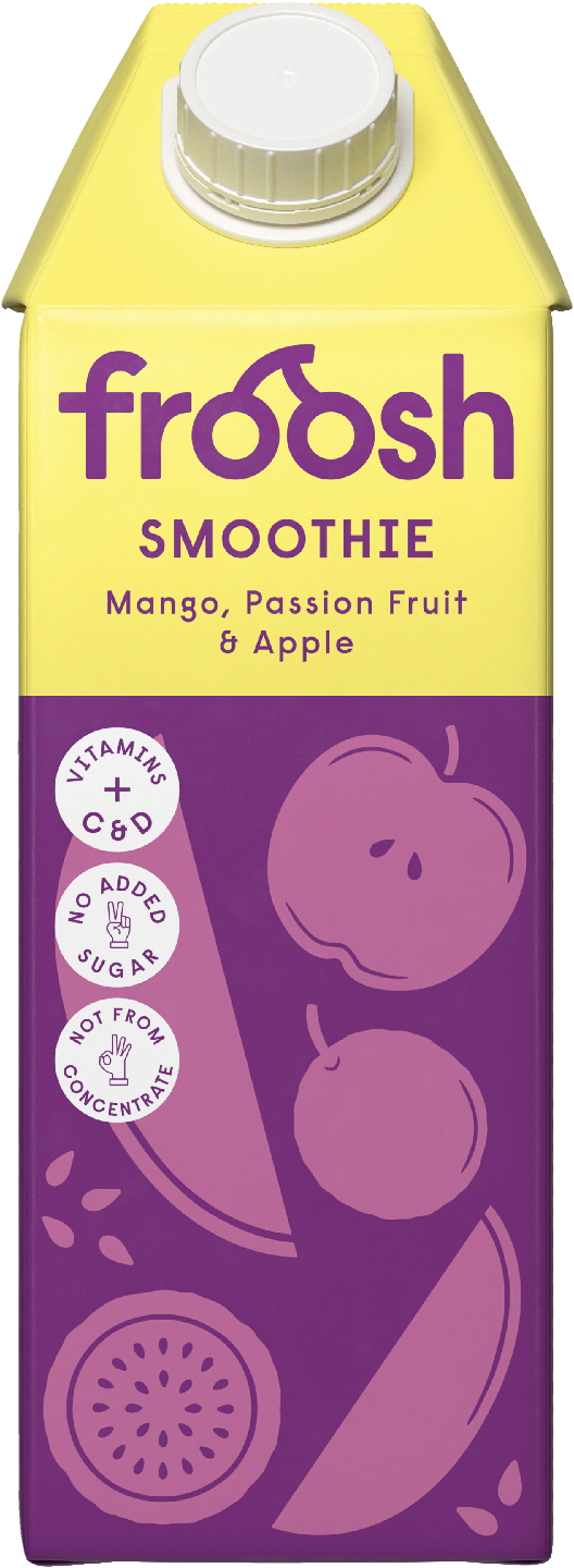 VegaaninenNauti ihanasta Froosh-smoothiesta, jossa ei ole lisättyä sokeria ja jota ei valmisteta tiivisteestä. Smoothie maistuu mangolle, passionhedelmälle ja omenalle ja siihen on lisätty C- ja D-vitamiineja. Froosh-smoothiet ovat täydellinen osa aamiaista tai kun tarvitset välipalaa.