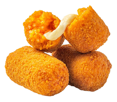 Keitetty tomaattiriisi 70 % [riisi 26 %, vesi, puolitiivistetty tomaattimassa (IT) 16 %, kasvisliemi (suola, perunatärkkelys, kuivatut vihannekset: sipuli, porkkana, SELLERI, persilja. Kasviproteiiniuute: SOIJA, maissi. Auringonkukansiemenöljy, mausteet, luonnolliset aromit), auringonkukansiemenöljy, juustojauhe (MAITO, suola, juoksute), porkkanat, sipulit, viini, suola, pippuri]. Leivitysaineet 14 % (VEHNÄ-jauho, vesi, suola, hiiva, luonnollinen väriaine: paprikauute), mozzarella-juusto (EU) 10 % (MAITO, suola, mikrobiologinen juoksute), taikina (vesi, VEHNÄ-jauho, suola), auringonkukansiemenöljy. Saattaa sisältää jäämiä: SINAPPI, KALA, ÄYRIÄISET, MUNA, PÄHKINÄT, LAKTOOSI, LUPIINI, SEESAMI, SULFIITIT, NILVÄISET.