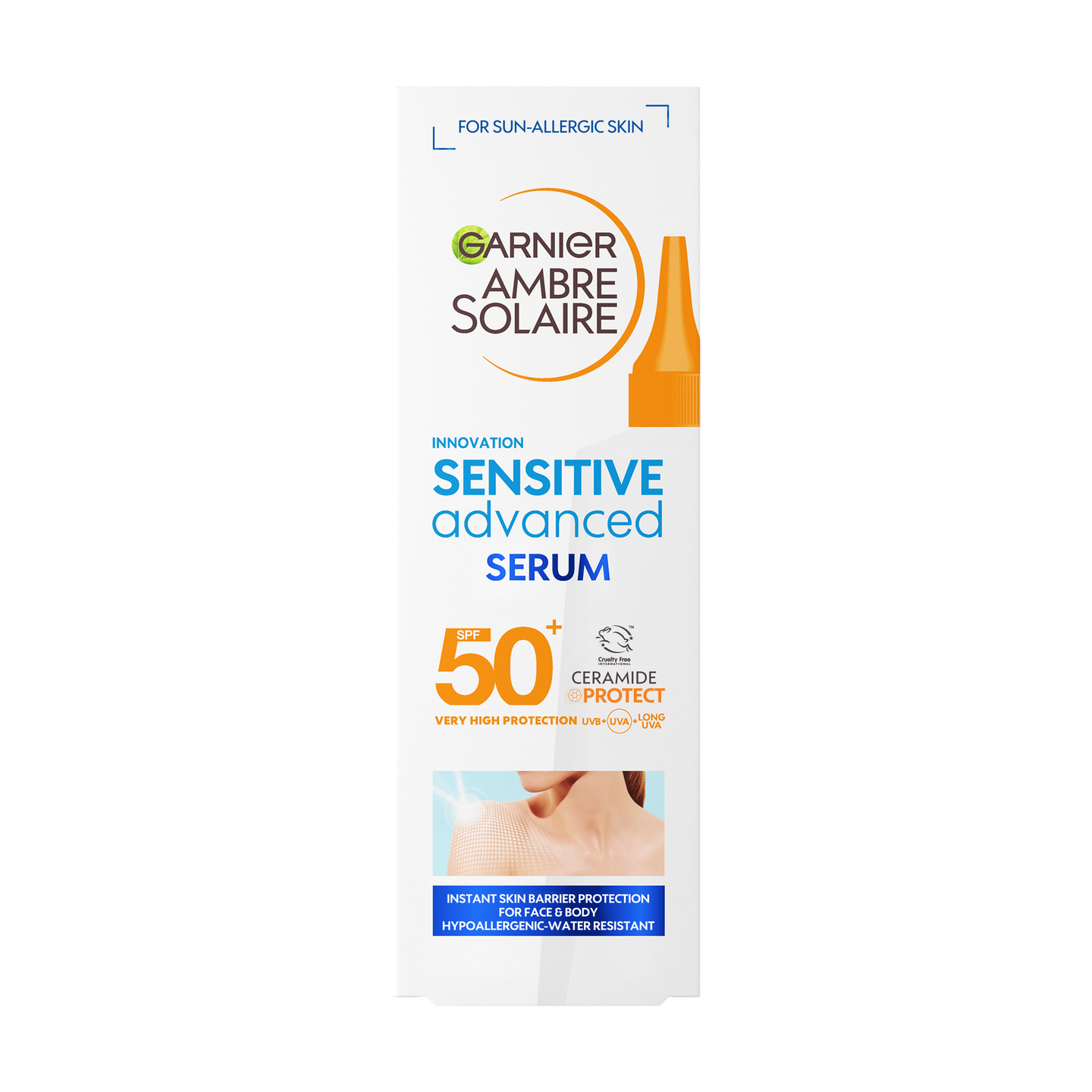 Suojaa ihosi päivittäin! Garnier Ambre Solaire Sensitive Advanced Body SPF 50+ -aurinkosuojaseerumin koostumus sisältää keramidia ja auttaa suojaamaan ihon suojamuurin toimintaa. Aurinkosuojaseerumin hypoallergeeninen koostumus on kehitetty herkälle & aurinkoherkälle iholle. Koostumus on hajusteeton ja sopii sekä kasvoille että vartalolle. Nestemäinen koostumus levittyy helposti ja tuntuu miellyttävältä herkimmälläkin iholla. Sopii erityisesti alueille, joilla on taipumus palaa auringossa (niska, rintakehä, käsivarret). Tuubi on valmistettu 38% kierrätetystä muovista*.