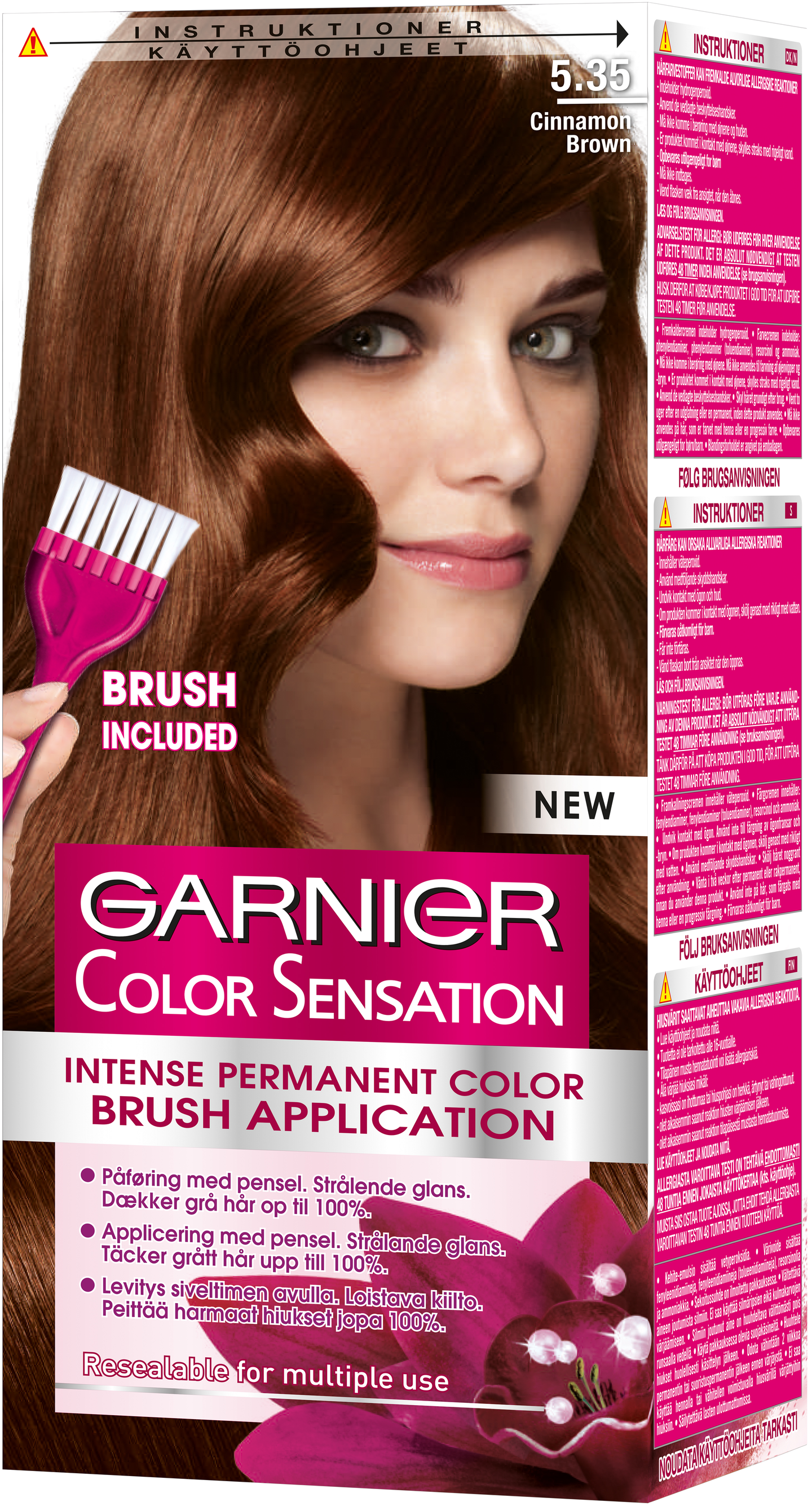 Garnier Color Sensation 5.35 Cinnamon Brown -kestovärin intensiiviset pigmentit ja Fade Resist-teknologia antavat jopa 10 viikkoa kestävän värjäystuloksen ja peittävät 100% harmaista hiuksista.