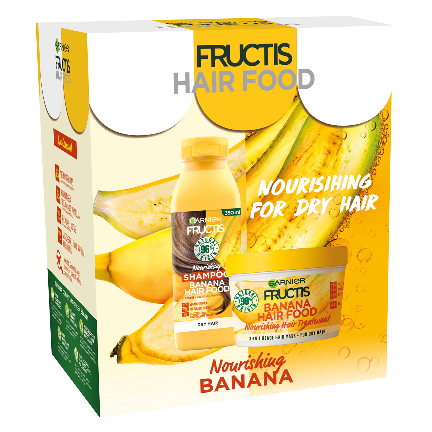 Garnier Fructis Hair Food Banana lahjapakkaus sisältää vegaanisen* ja 98% luonnollista alkuperää olevan shampoon ja monikäyttöisen hiusnaamion kuivien hiusten ravitsemiseen. Kevyesti vaahtoava banaanishampoo puhdistaa hellävaraisesti, ravitsee ja antaa hiuksillesi elinvoimaa niitä latistamatta. Monikäyttöinen hiusnaamio imeytyy hiuksiin välittömästi, aivan kuin hiukset ”söisivät” sen. Kolme tapaa ravita kuivimmatkin hiukset – hoitoaineena, hiusnaamiona tai hiuksiin jätettävänä hoitoaineena. Lopputulos on sama: ravitut ja vahvistuneet hiukset. Ilman silikonia luonnollisen tunteen aikaansaamiseksi. *Ei sisällä eläinperäisiä ainesosia tai sivutuotteita.
