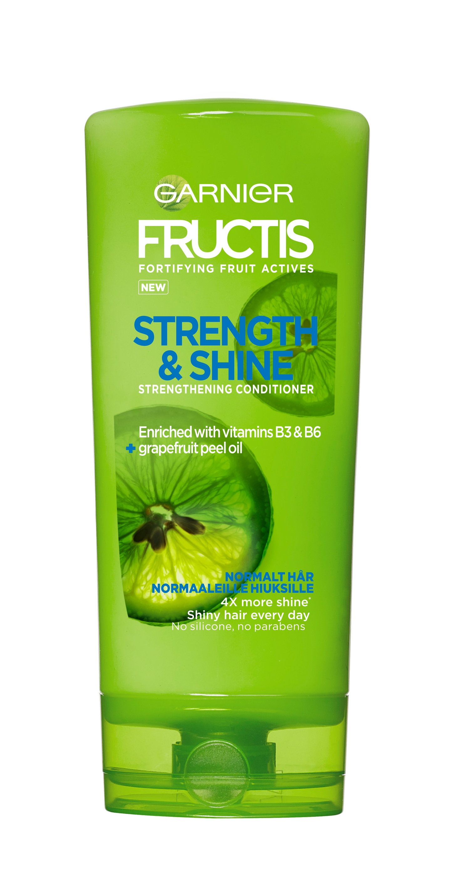 Normaaleille hiuksille. Fructis Strength & Shine hoitoaine on kehitetty erityisesti normaaleille hiuksille. Koostumus sisältää greipinkuoriöljyä sekä B3- ja B6-vitamiineja ja vahvistaa hiuskuitua sekä tekee hiuksista kiiltävät tyvestä latvaan. Hoitoaine ei sisällä silikonia.