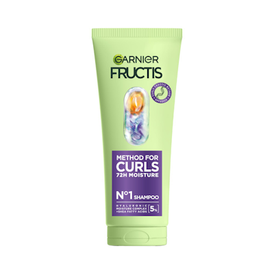 Garnier Fructis Method for Curls -shampoo on kehitetty hemmottelemaan kiharia hiuksia. Method for Curls -hiustenhoitorutiinin vaihe N°1 pesee hellävaraisesti kiharat hiukset ja täyttää niitä kosteudella 72 tunnin ajaksi*. Koostumus sisältää 5% kosteuttavien ainesosien yhdistelmää, joka sisältää hyaluronihappoa ja rasvahappoja karitevoista. Testattu eri tyyppisillä kiharoilla, Fructis Method for Curls -menetelmän hyväksymä. Täydennä rutiinisi Fructis Method for Curls N°0 kosteuttavalla ennen pesua käytettävällä käsittelyllä , N°2 intensiivisesti kosteuttavalla hiusnaamiolla ja N°3 kosteuttavalla suihkeella.