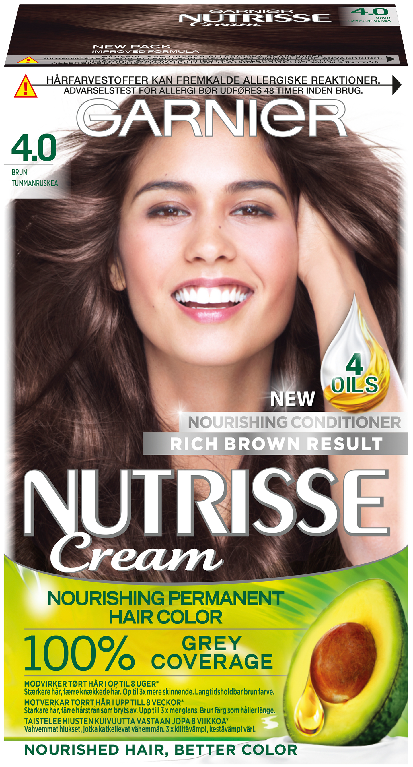 Ravitut hiukset, parempi väri. Nutrisse Cream -hiusväri antaa peittävän ja luonnolliselta näyttävän lopputuloksen. Uusi hoitoaine sisältää 4 öljyä: avokado-, oliivi- ja kariteöljyä sekä uutta karpaloöljyä, jotka sulkevat hiuskuidut. Koostumus ravitsee ja vahvistaa hiuksia sekä suojaa niitä katkeilulta. Hiukset tuntuvat erittäin pehmeiltä. Väri on 3 x kiiltävämpi ja kestää 3 x kauemmin. Lue käyttöohjeet ja noudata niitä. Tätä tuotetta ei ole tarkoitettu alle 16-vuotiaiden käyttöön.