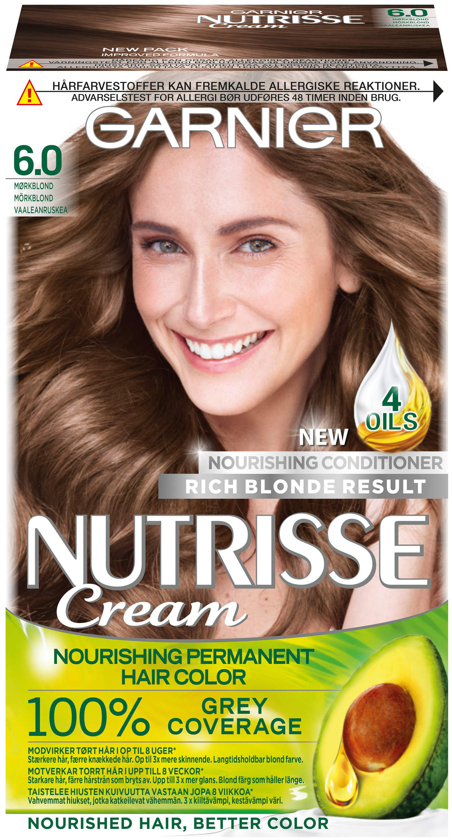 Ravitut hiukset, parempi väri. Nutrisse Cream -hiusväri antaa peittävän ja luonnolliselta näyttävän lopputuloksen. Uusi hoitoaine sisältää 4 öljyä: avokado-, oliivi- ja kariteöljyä sekä uutta karpaloöljyä, jotka sulkevat hiuskuidut. Koostumus ravitsee ja vahvistaa hiuksia sekä suojaa niitä katkeilulta. Hiukset tuntuvat erittäin pehmeiltä. Väri on 3 x kiiltävämpi ja kestää 3 x kauemmin. Lue käyttöohjeet ja noudata niitä. Tätä tuotetta ei ole tarkoitettu alle 16-vuotiaiden käyttöön.