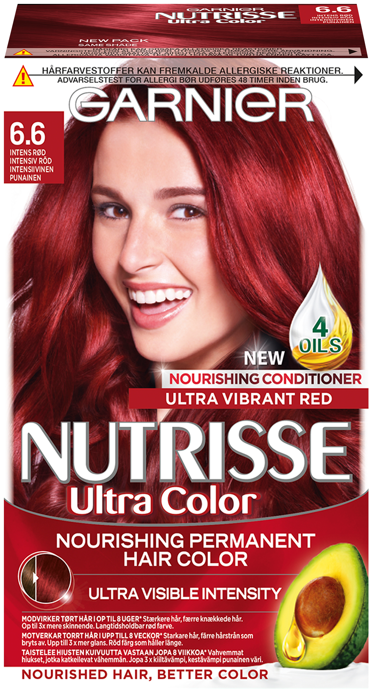 Ravitut hiukset, parempi väri. Nutrisse Cream -hiusväri antaa peittävän ja luonnolliselta näyttävän lopputuloksen. Uusi hoitoaine sisältää 4 öljyä: avokado-, oliivi- ja kariteöljyä sekä uutta karpaloöljyä, jotka sulkevat hiuskuidut. Koostumus ravitsee ja vahvistaa hiuksia sekä suojaa niitä katkeilulta. Hiukset tuntuvat erittäin pehmeiltä. Väri on 3 x kiiltävämpi ja kestää 3 x kauemmin. Lue käyttöohjeet ja noudata niitä. Tätä tuotetta ei ole tarkoitettu alle 16-vuotiaiden käyttöön.